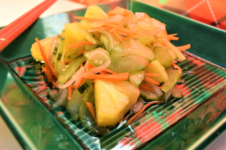 What I love about this dish is its crunchiness – a mixture of English cucumbers, carrots, pineapples and onions with toasted sesame seeds soaked in vinegar and sugar syrup. This is one of the dishes that I will make countless times as it comes in really handy. I love to make a BIG portion, chill it in the fridge and have it as an appetizer or a side dish for my meals.