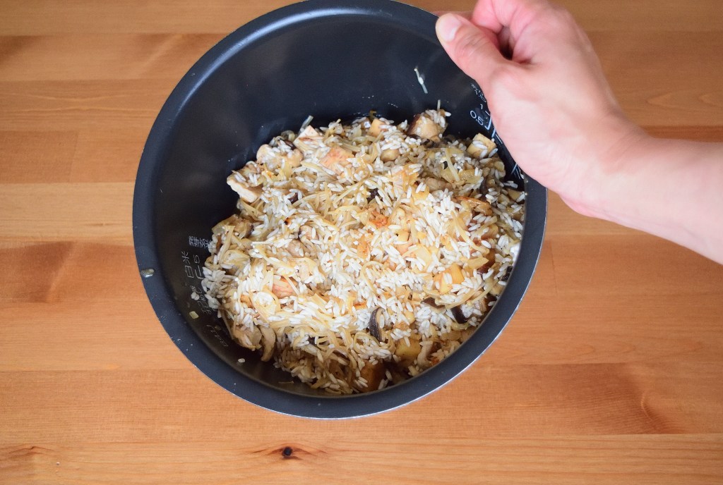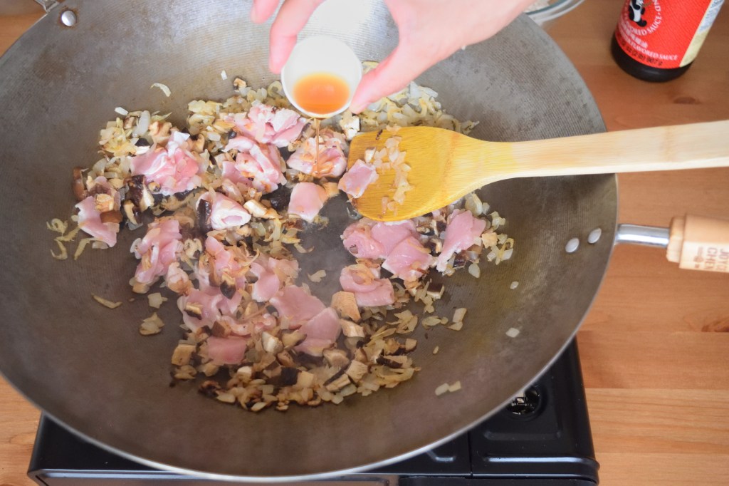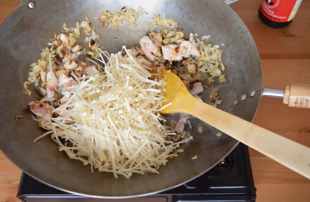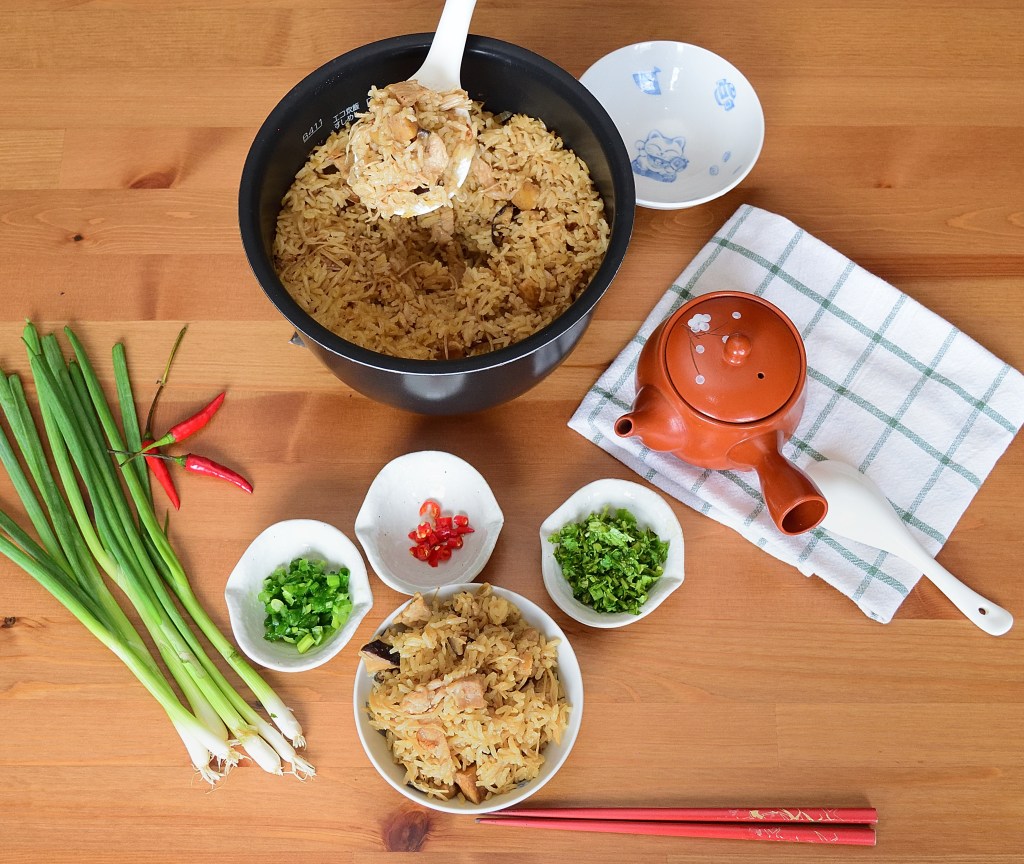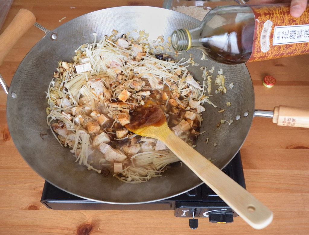 Prepare a wok or large frying pan on medium heat. Add in 2 tablespoon of sesame oil and once oil is just about to heat up, add in diced onion (or shallots) and saute for 5 seconds before adding in dried shrimp, diced shiitake mushroom and sliced pork. Add in 1 more tablespoon of sesame oil if the mixture gets dry. Saute until the pork is half cooked and add in enoki mushroom, yam, 4 tablespoon of oyster sauce, 2 tablespoon of soy sauce and 1 tablespoon of cooking wine. Mix well before adding in the rice. Saute for 5 seconds and turn off the heat. Transfer the rice mixture to the rice cooker immediately. Add in 2 – 2.5 rice cups (1.5 – 2 measuring cups) of water and cook the rice. The amount of water added should be based on how you normally cook plain white rice or just slightly more, depending on how much yam (taro) is used. Since I don’t use that much of yam (taro) for this recipe, the water I added is based on how I normally cook plain white rice.