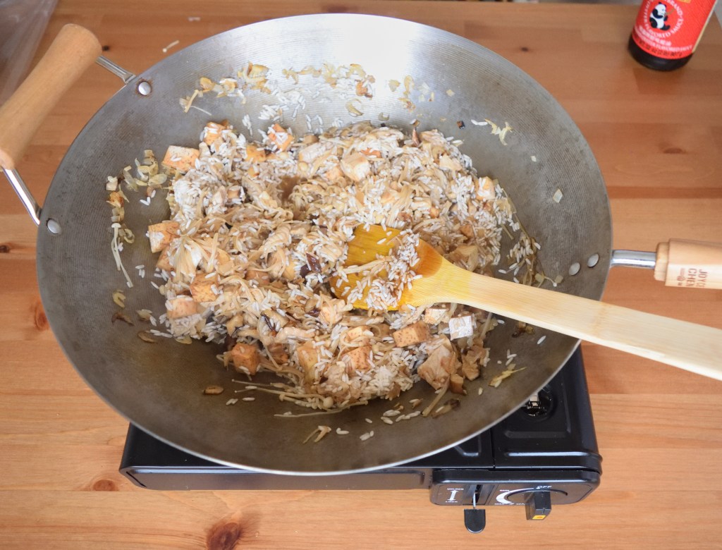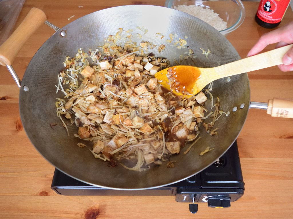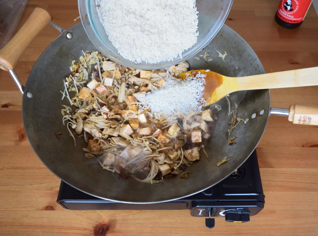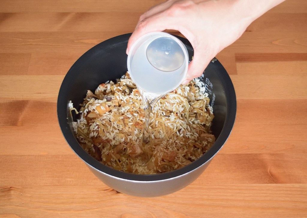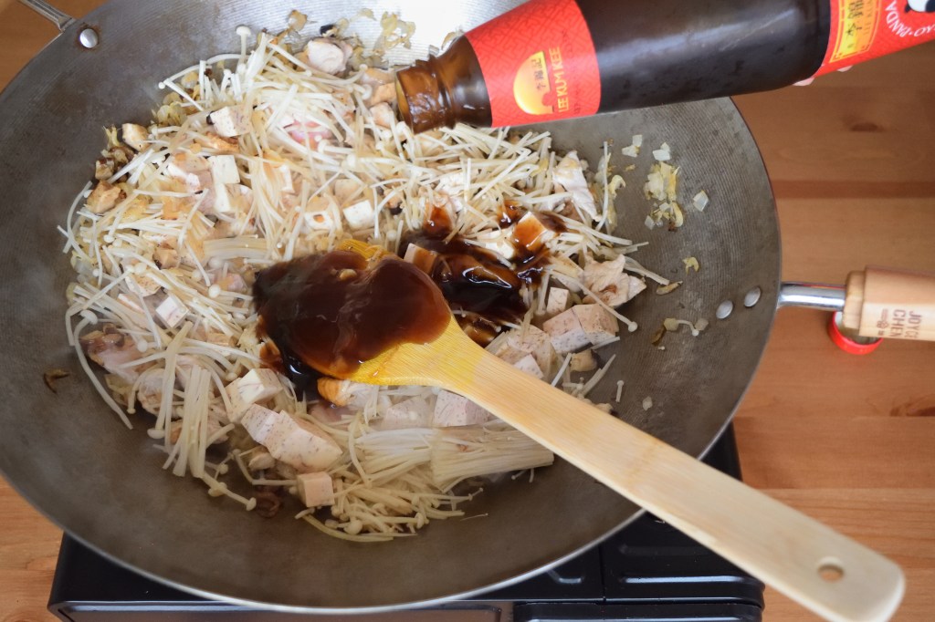 Prepare a wok or large frying pan on medium heat. Add in 2 tablespoon of sesame oil and once oil is just about to heat up, add in diced onion (or shallots) and saute for 5 seconds before adding in dried shrimp, diced shiitake mushroom and sliced pork. Add in 1 more tablespoon of sesame oil if the mixture gets dry. Saute until the pork is half cooked and add in enoki mushroom, yam, 4 tablespoon of oyster sauce, 2 tablespoon of soy sauce and 1 tablespoon of cooking wine. Mix well before adding in the rice. Saute for 5 seconds and turn off the heat. Transfer the rice mixture to the rice cooker immediately. Add in 2 – 2.5 rice cups (1.5 – 2 measuring cups) of water and cook the rice. The amount of water added should be based on how you normally cook plain white rice or just slightly more, depending on how much yam (taro) is used. Since I don’t use that much of yam (taro) for this recipe, the water I added is based on how I normally cook plain white rice.