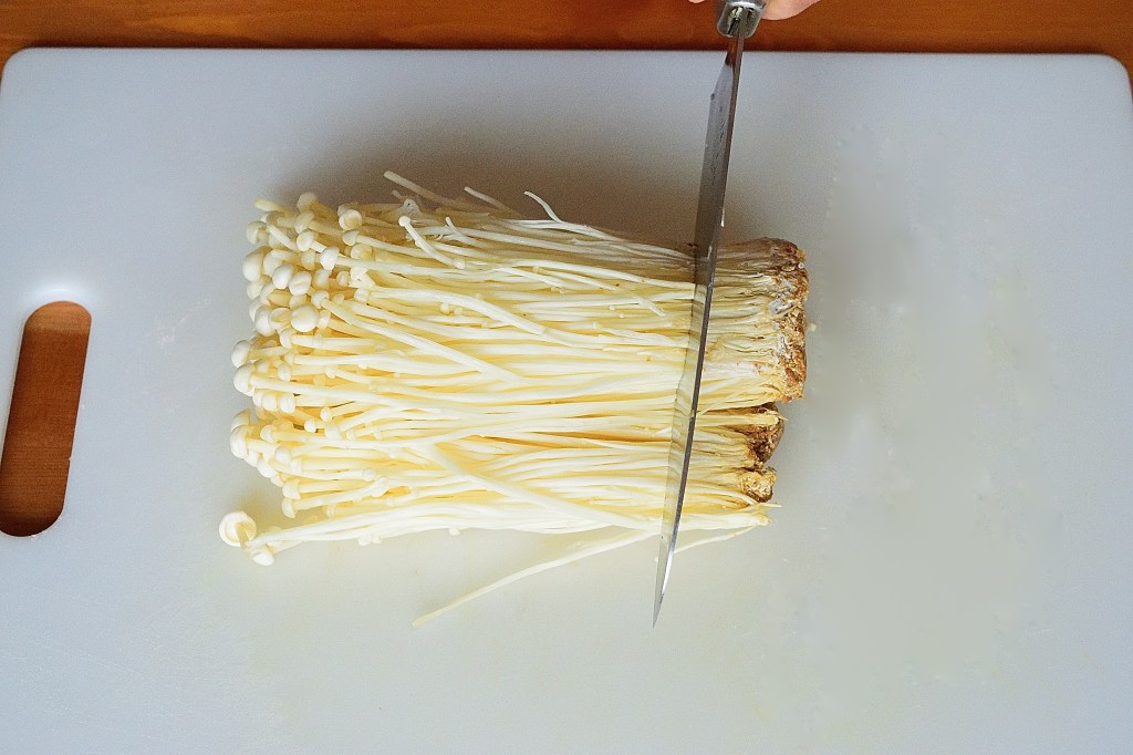 Remove the skin of yellow onion (or shallots) and dice the onion (or shallots). Use a knife to peel off the skin of yam and cut into cubes. Next, dice the shiitake mushroom. Remove the stem of enoki mushroom, cut in half and wash thoroughly with water. Slice the pork loin thinly of about 1 inch square shape.