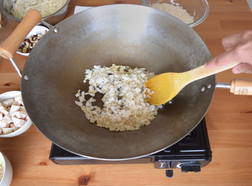 The ingredients are 2 rice cups (1.5 – 2 measuring cups) of long grain white rice, 1 lb yam (450gram) of yam (taro), 1 medium-sized yellow onion (or 5 small shallots), 4 dried shiitake mushroom, 1 pack of enoki mushroom, 1/2 lb (225 gram) of pork loin, 1/3 cups of dried shrimp, 4 tablespoon of oyster sauce, 2 tablespoon of soy sauce, 1 tablespoon of cooking wine, 2 – 3 tablespoon of sesame oil and 2 – 2.5 rice cups (1/5 – 2 measuring cups) of water.